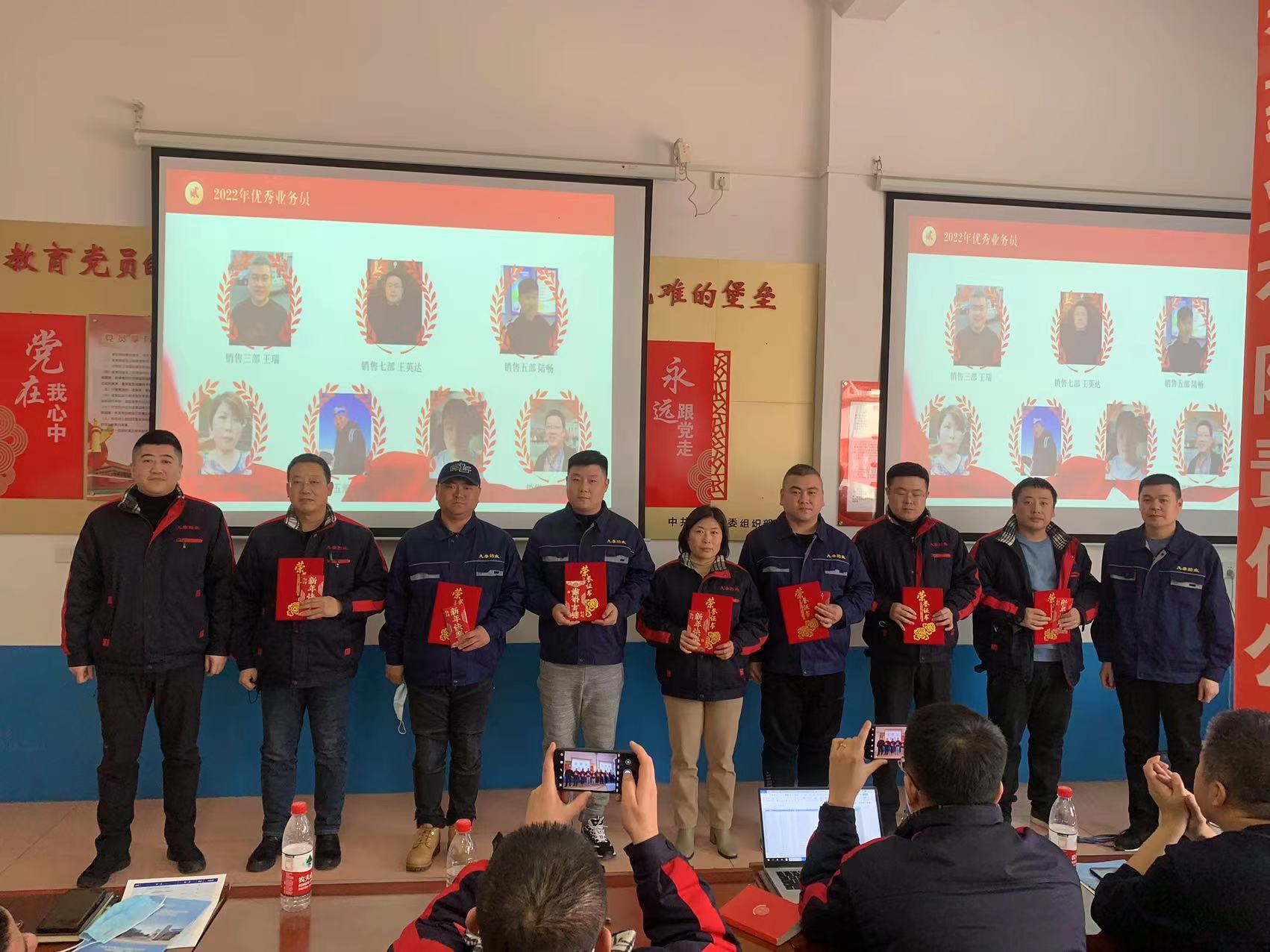 本次會議對2022年度取得較好業(yè)績的優(yōu)秀業(yè)務(wù)員、優(yōu)秀內(nèi)勤及優(yōu)秀班組進行了表彰,對他們在2022年付出的艱辛和努力給予肯定,號召大家以優(yōu)秀為榜樣,向他們看齊。為了確保高質(zhì)量完成營銷目標,在本次會議上,公司總經(jīng)理李百洋與營銷中心總經(jīng)理郭少剛分別與八位總監(jiān)簽署了2023年度崗位聘書及目標責任狀,壓實各項銷售指標的分解與落實。